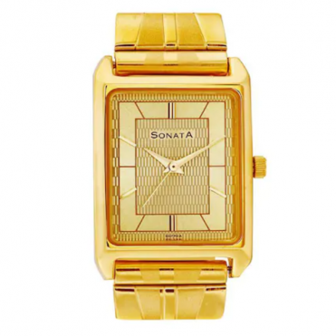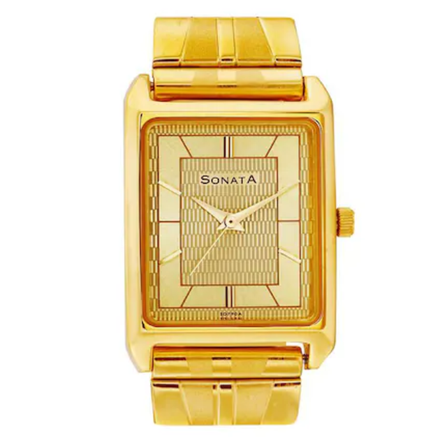 The watch also has slanted markings at five-minute intervals. The gold strap is made of sheet metal and has a special three-piece sliding clasp. The case diameter is 1 inch
